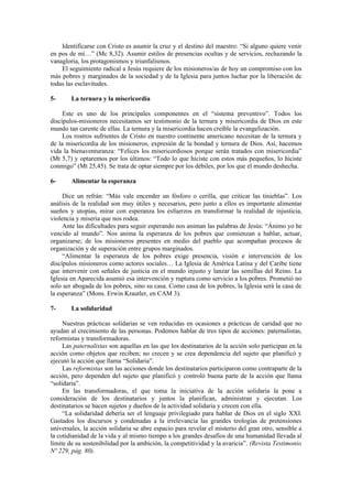 1) El documento describe 10 características clave de la misión de los discípulos-misioneros de Jesús en el mundo, incluyendo tener una identidad propia, valorar lo cotidiano, y vivir una vida contemplativa. 2) También enfatiza la importancia de un seguimiento radical a Jesús, mostrar ternura y misericordia, alimentar la esperanza, y practicar la solidaridad. 3) Finalmente, destaca la necesidad de tener una conciencia misionera, ecuménica y universal que reconozca la diversidad de culturas.