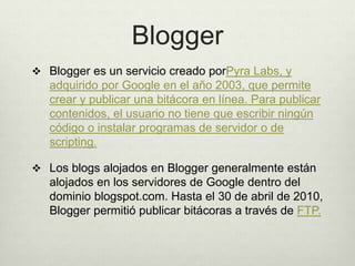 El documento describe varias herramientas web 2.0 como Blogger (un servicio para crear bitácoras), About.me (una tarjeta de visita online), Wordle (una herramienta para crear nubes de palabras), Educaplay (una página para crear actividades educativas online), Storybird (una herramienta para crear historias a partir de imágenes), Photofunia (una página para añadir efectos a fotos), SlideShare (un sitio para compartir presentaciones) y otras herramientas.