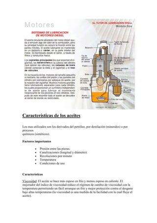 Los aceites más utilizados son los derivados del petróleo, ya sea por destilación para obtener aceites minerales o por procesos químicos para obtener aceites sintéticos. Los factores importantes que afectan los aceites son la presión, las características de las canalizaciones, las revoluciones por minuto, la temperatura y las condiciones de uso. Las principales características de los aceites son la viscosidad, la untuosidad, el punto de congelación, la detergencia, la estabilidad química, la inhibición de