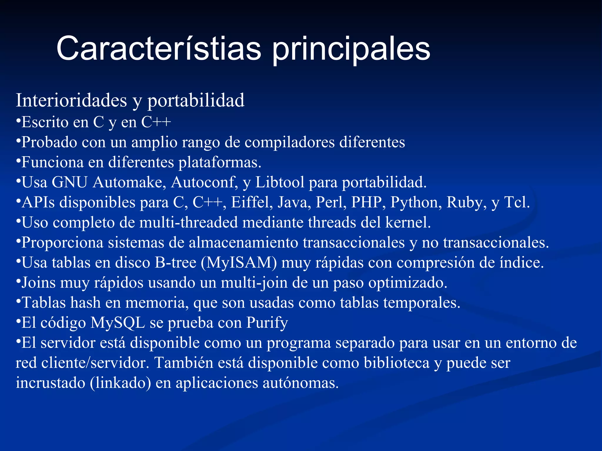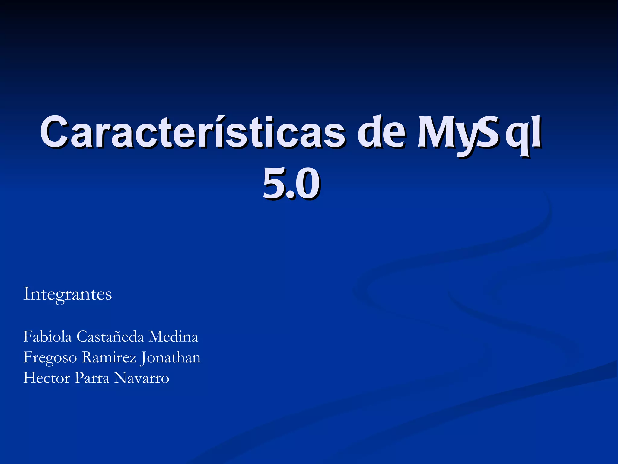 MySQL 5.0 es un sistema de gestión de bases de datos relacionales que es portable, escalable y seguro. Ofrece tipos de datos flexibles, soporte para consultas SQL complejas, y conectividad a través de sockets, memoria compartida y ODBC/JDBC. También proporciona herramientas para administrar y optimizar bases de datos.