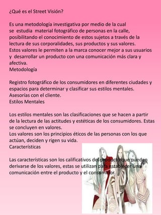 Este documento describe el método de investigación de mercados llamado "Street Vision", el cual involucra tomar fotografías de personas en la calle para analizar sus estilos de vida y valores a través de su apariencia y comportamiento. Luego, categoriza a los consumidores en diferentes "estilos mentales" basados en actitudes y preferencias estéticas. El objetivo es que las marcas puedan desarrollar productos y comunicaciones más efectivas al comprender mejor a sus clientes. El documento presenta varios ejemplos de cómo se caracterizan diferentes estilos mentales.