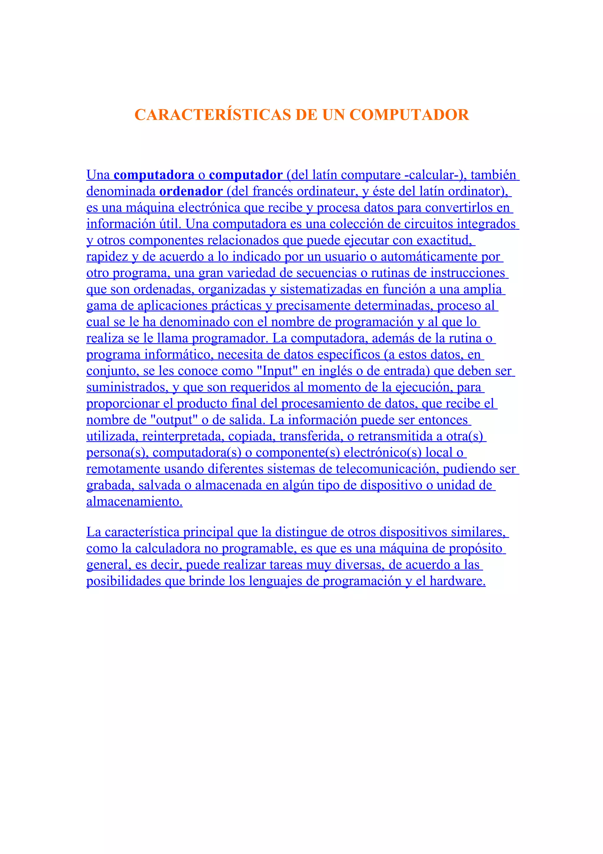 Una computadora es una máquina electrónica que recibe datos como entrada, los procesa y los convierte en información útil como salida. Puede ejecutar una variedad de instrucciones de manera precisa y rápida según lo programado por un usuario o programa. La característica principal que distingue a una computadora de otros dispositivos es que es una máquina de propósito general que puede realizar diversas tareas según el lenguaje de programación y hardware utilizados.