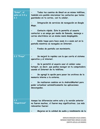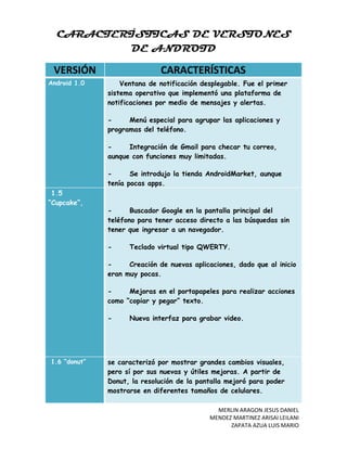 Este documento describe las características clave de las diferentes versiones de Android desde la versión 1.0 hasta la 4.4 KitKat. Algunas de las primeras versiones introdujeron la ventana de notificaciones desplegable, integración con Gmail y Google Maps, y mejoras en el teclado y portapapeles. Versiones posteriores agregaron funciones como contactos rápidos, fondos de pantalla en movimiento, soporte para videollamadas, y reconocimiento facial para desbloqueo. La versión más reciente, KitKat, tiene un diseño minimalista con icon