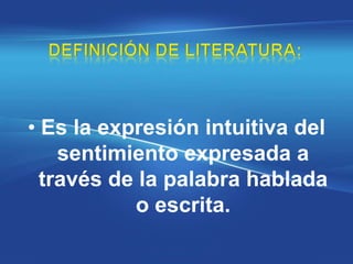 El documento resume los aspectos fundamentales de la literatura, incluyendo su origen como expresión intuitiva del sentimiento, sus funciones poéticas y emotivas, y su forma a través del ritmo y rima. También menciona brevemente algunos ejemplos literarios como poemas.