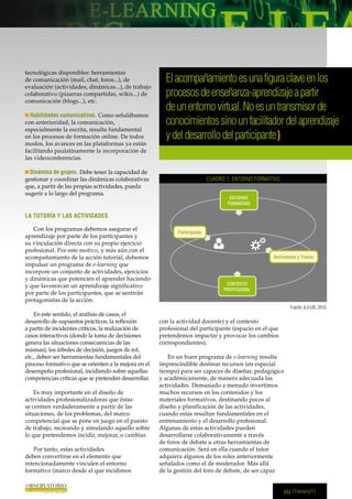 El documento describe la importancia de la tutoría en los procesos de e-learning. Indica que el tutor no es solo un transmisor de conocimientos, sino un facilitador del aprendizaje y del desarrollo del participante. El tutor debe asumir roles como facilitador, motivador, moderador y socializador a lo largo del proceso formativo. También destaca la importancia de incluir actividades prácticas como casos, supuestos y juegos de rol que vinculen el aprendizaje con el contexto profesional. Además, propone involucrar al má