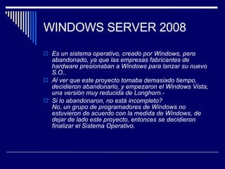 Windows Server 2008 es el sucesor de Windows Server 2003. Es un sistema operativo para servidores con características similares a Windows Vista. Microsoft anunció que habrá tres ediciones principales de Windows Server 2008 - Standard, Enterprise y DataCenter - cada una con la opción de incluir Hyper-V para virtualización. El sistema operativo incluye mejoras en rendimiento, seguridad, administración remota y control de hardware.