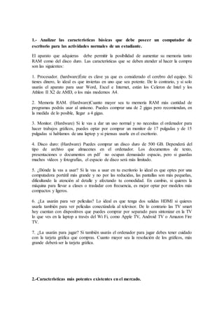 El documento proporciona recomendaciones sobre las características básicas que debe tener una computadora de escritorio para un estudiante, incluyendo un procesador potente como un Intel Celeron o AMD Athlon II X2, al menos 2 GB de RAM, un monitor de 15-17 pulgadas, un disco duro de 500 GB, y consideraciones sobre el uso y portabilidad. También describe las especificaciones de un modelo Toshiba Satellite como procesador i7, 12 GB de RAM, 1 TB de disco duro y sistema operativo Windows 8 de 64 bits.