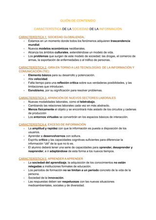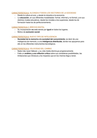 El documento describe 9 características clave de la sociedad de la información: 1) Es una sociedad globalizada con problemas globales como las drogas y el comercio de armas; 2) Gira en torno a las tecnologías de la información y la comunicación; 3) Surgen nuevos sectores laborales como el teletrabajo; 4) Hay un exceso de información que requiere capacidades críticas para filtrar lo útil; 5) Se aprende a lo largo de la vida a través de la educación formal e informal; 6) Afecta a todos los sectores