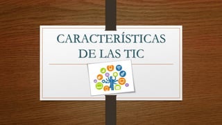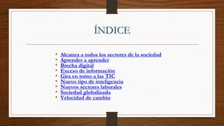 El documento describe las características principales de las tecnologías de la información y la comunicación (TIC) en la sociedad. Las TIC ahora alcanzan a todos los sectores de la sociedad y han creado una brecha digital. También han generado una avalancha de información y están transformando la inteligencia, los sectores laborales y creando una sociedad globalizada. Sin embargo, a veces se incorporan las TIC más por moda que por su utilidad real.