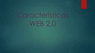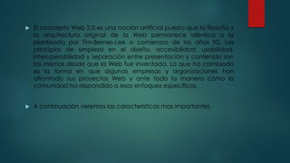El documento describe las características principales de la Web 2.0. Aunque la filosofía subyacente de la Web permanece igual desde su creación, ha cambiado la forma en que las empresas y organizaciones usan la Web y cómo los usuarios interactúan en ella. Algunas características clave de la Web 2.0 incluyen que es una plataforma en línea, facilita el acceso a servicios y contenido, es social gracias a la participación de los usuarios, y permite combinar aplicaciones para crear nuevas funcionalidades.