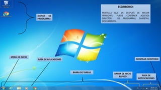 El documento describe las principales características de la pantalla de inicio de Windows, incluyendo el escritorio, iconos de programas, barra de tareas, menú de inicio y áreas de aplicaciones, notificaciones y búsqueda. También explica opciones para apagar, reiniciar o cambiar de usuario, y proporciona instrucciones para crear carpetas y copiar, mover o cortar archivos.