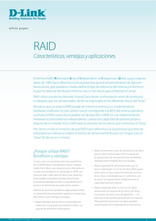RAID (Redundant Array of Independent Disks) es una arquitectura de almacenamiento que combina múltiples discos duros para mejorar el rendimiento, la fiabilidad y la capacidad. RAID distribuye los datos entre los discos a través de técnicas como "striping" y genera paridad para tolerar fallos. Ofrece ventajas como mayor rendimiento, capacidad y fiabilidad frente a discos individuales, aunque no protege contra errores humanos ni facilita migraciones. Existen diferentes niveles de RAID como RAID 0, 1 y 5