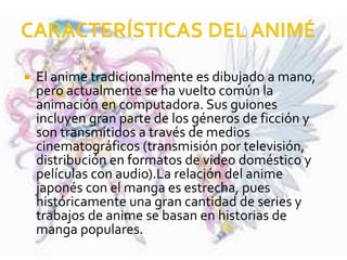 El documento resume las características principales del anime japonés. Explica que tradicionalmente el anime se dibujaba a mano pero ahora también se usa animación por computadora, y que a menudo se basa en historias de manga populares. También describe algunos de los géneros comunes del anime como las series con tramas complejas que se desarrollan a lo largo de múltiples episodios y cómo en la década de 1970 el anime empezó a abordar temas más maduros dirigidos a audiencias adultas.