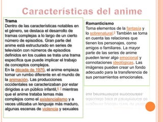 El anime es el término que identifica a los dibujos animados de origen japonesa. Se caracteriza por tramas complejas a lo largo de varios episodios, abordar temas más maduros que los dibujos animados occidentales, y tomar elementos de la fantasía, lo sobrenatural y las relaciones entre los personajes. El diseño de los personajes en el anime se distingue por ojos grandes y expresivos, diversos peinados y colores de cabello, proporciones del cuerpo estilizadas, y uso de expresiones faciales exageradas