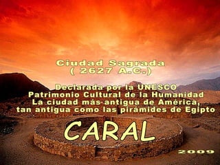 Caral, situada en el valle de Supe, es la ciudad más antigua de América, declarada patrimonio cultural de la humanidad por la UNESCO. Esta civilización andina, que floreció entre 2627 a.C. y 2009, desarrolló una organización social compleja, con avances en agricultura, comercio y religión. La ciudad es célebre por sus pirámides y monumentos arquitectónicos, además de ser un centro de innovación cultural que incluye la música y expresión artística.