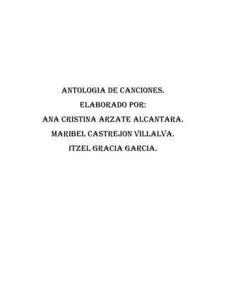 Este documento es una antología de canciones elaborada por tres autoras: Ana Cristina Arzate Alcantara, Maribel Castrejón Villalva e Itzel Gracia García.