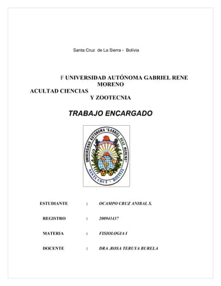 El documento contiene tres asignaciones de tareas para estudiantes de la Facultad de Ciencias Veterinarias de la Universidad Autónoma Gabriel Rene Moreno. Cada asignación incluye el nombre del estudiante, su número de registro, la materia (Fisiología I) y el docente (Dra. Rosa Teruya Burela).