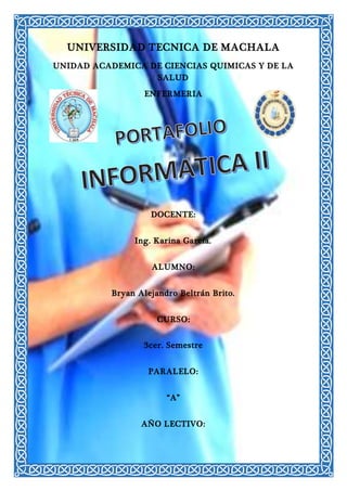 Este documento es un informe de un estudiante de enfermería de la Universidad Técnica de Machala en Ecuador. El estudiante, Bryan Alejandro Beltrán Brito, está cursando el tercer semestre del programa de enfermería en el año lectivo 2015-2016 bajo la docente Ing. Karina García.