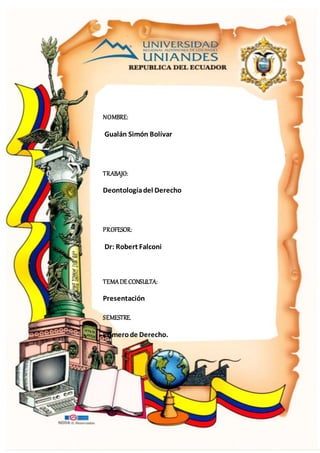 Este documento presenta información básica sobre un estudiante llamado Gualán Simón Bolívar que cursa el primer semestre de Derecho. El estudiante toma la asignatura Deontología del Derecho impartida por el Dr. Robert Falconi y busca asesoramiento sobre la presentación de un tema.
