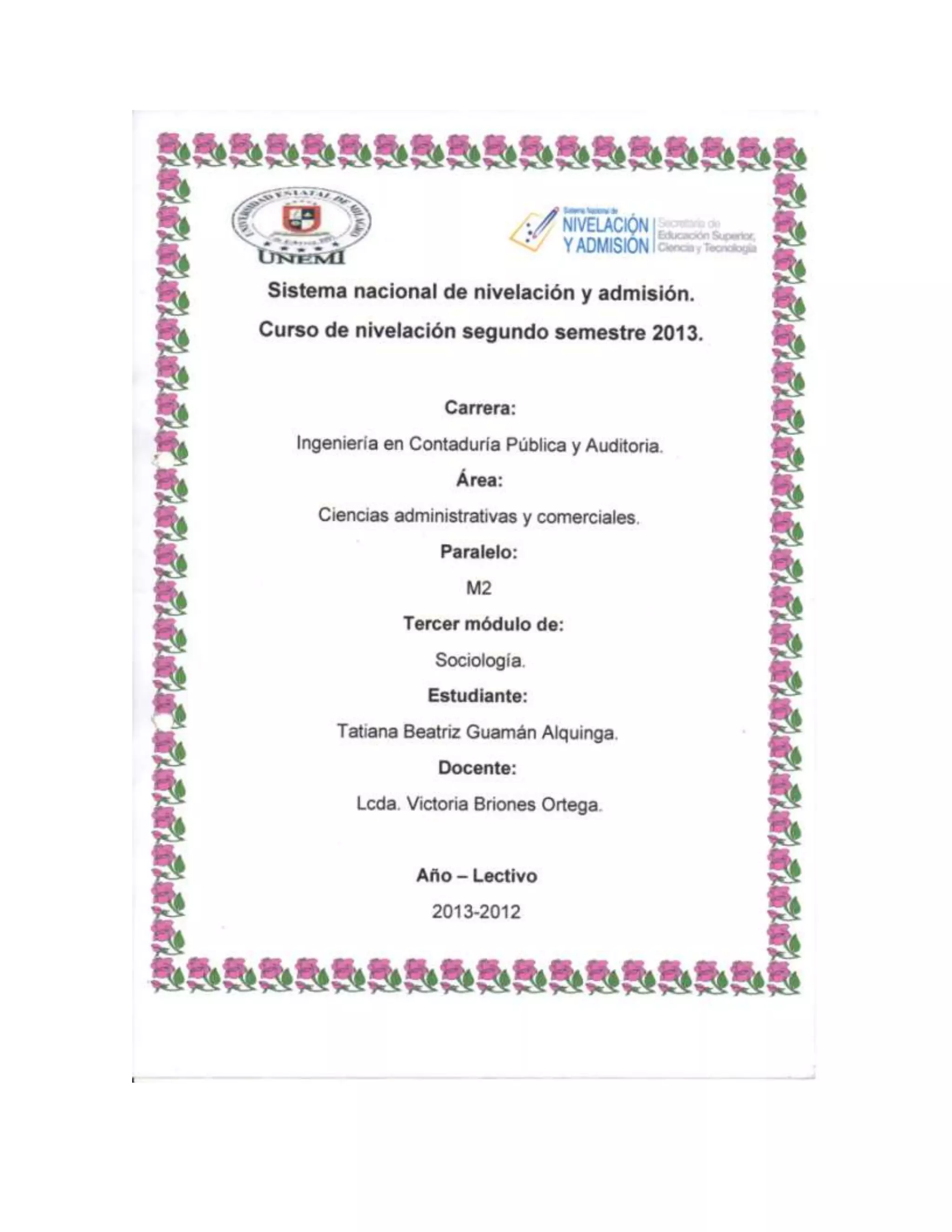 La caratula de Sociologia, el horario de clases, el trabajo en clase.