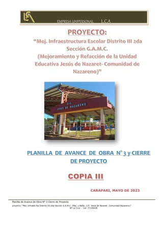 La planilla de avance de obra n° 3 y cierre de proyecto presenta la documentación requerida para el cierre del proyecto de mejoramiento de infraestructura escolar en el distrito III, incluyendo el informe técnico, certificado de avance de obra, planos, cronograma, registros fotográficos y certificados de calidad de materiales.