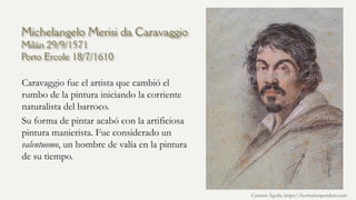 Michelangelo Merisi da Caravaggio fue un pintor italiano del siglo XVII que revolucionó la pintura con su estilo naturalista. Nació en Milán en 1571 y murió en 1610. Aprendió pintura en Roma y desarrolló una técnica que utilizaba fuertes contrastes de luz y sombras. Pintó obras religiosas realistas que causaron controversia. Tuvo que huir de Roma en 1606 tras matar a otro hombre y pasó sus últimos años huyendo antes de morir en Porto Ercole.