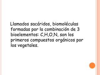 Los sacáridos son biomoléculas formadas por carbono, hidrógeno y oxígeno que son los primeros compuestos orgánicos producidos por las plantas. Cumplen funciones energéticas, estructurales y farmacológicas. Se clasifican en monosacáridos, disacáridos, polisacáridos y mucopolisacáridos.
