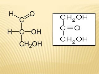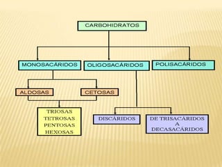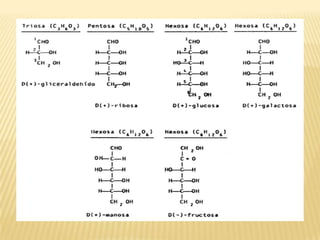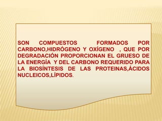 Este documento proporciona información sobre los carbohidratos. Explica que son compuestos formados por carbono, hidrógeno y oxígeno que proveen la mayor parte de la energía y el carbono necesarios para la biosíntesis. Describe los diferentes tipos de carbohidratos como monosacáridos, disacáridos y polisacáridos dando ejemplos importantes como la glucosa, fructuosa, almidón, glucógeno y celulosa.