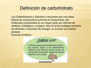 Los carbohidratos son compuestos químicos formados principalmente por carbono, hidrógeno y oxígeno que cumplen funciones estructurales y metabólicas en organismos vivos. Pueden clasificarse como monosacáridos, disacáridos, oligosacáridos o polisacáridos dependiendo de su tamaño molecular. Los polisacáridos como el almidón, glucógeno y celulosa cumplen funciones de almacenamiento de energía o estructurales en plantas y animales.