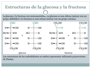 Los carbohidratos son compuestos orgánicos que incluyen monosacáridos, disacáridos y polisacáridos. Los monosacáridos más comunes son la glucosa y la fructosa. La glucosa forma un hemiacetal cíclico de seis miembros llamado glucopiranosa, mientras que la fructosa forma un anillo de cinco miembros. Los monosacáridos se pueden unir a través de enlaces glucosídicos para formar disacáridos como la sacarosa y polisacá
