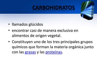 El documento proporciona información sobre los carbohidratos, incluyendo que son glúcidos encontrados principalmente en alimentos de origen vegetal, cumplen funciones energéticas y de regulación metabólica, y pueden ser simples o complejos. También describe conceptos clave relacionados con su metabolismo como la glucólisis, gluconeogénesis, glucógeno y su almacenamiento e hidrólisis.