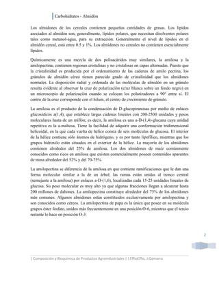 El documento describe las propiedades del almidón, un polisacárido vegetal formado por amilosa y amilopectina. Explica que el almidón se extrae de tubérculos y raíces como la papa y la yuca. Incluye experimentos para detectar almidón y determinar su punto de gelatinización usando reacciones con yodo.