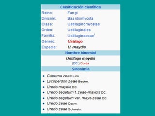 Este documento lista varios tipos de carbones (hongos) que afectan cultivos como maíz, trigo, avena y cebada. Describe los síntomas, signos y ciclos de vida de algunos carbones importantes como Ustilago maydis (carbón del maíz), Ustilago hordei (carbón cubierto de la cebada), Tilletia caries (carie del trigo) y Urocystis cepulae (carbón de la cebolla). También recomienda el uso de fungicidas sistémicos como Baytan 150 FS y