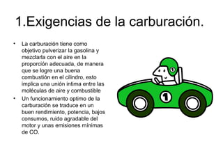 El documento describe los principales componentes y sistemas de un carburador, incluyendo el proceso de carburación, los carburadores, la corrección automática de la riqueza de la mezcla aire-combustible, los economizadores y enriquecedores, la bomba de aceleración, los dispositivos para la marcha en ralentí y el arranque en frío, el sistema de parada, el dispositivo de caldeo, y los sistemas para la apertura de mariposas.