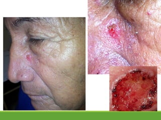 Este documento describe dos casos clínicos de carcinoma basocelular. El primer caso es de una mujer de 60 años con lesiones elevadas, brillantes y eritematosas en la cara que fueron diagnosticadas como carcinoma basocelular nodular tras una biopsia. El segundo caso es de un hombre de 72 años con una lesión tumoral pruriginosa y sangrante en la cara diagnosticada también como carcinoma basocelular.