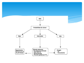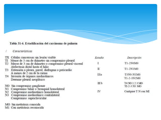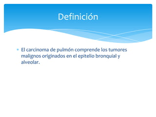 El documento describe el carcinoma de pulmón, incluyendo su definición, epidemiología, síntomas, clasificación, diseminación, estudios de diagnóstico, tratamiento y resecabilidad. El carcinoma de pulmón comprende tumores malignos originados en el epitelio bronquial y alveolar y es la principal causa de muerte por cáncer en los Estados Unidos. Los factores de riesgo principales son el tabaquismo y la exposición al humo de segunda mano.