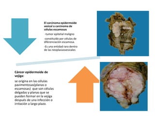 El carcinoma epidermoide vesical es un tumor raro de células escamosas originado por irritación crónica, afectando principalmente a hombres de 60 a 70 años. Los factores de riesgo incluyen esquistosomiasis, tabaquismo y radioterapia pélvica, y la enfermedad suele diagnosticarse en etapas avanzadas con un mal pronóstico. Los síntomas incluyen hematuria y disuria, y el tratamiento más efectivo es la cistectomía radical.