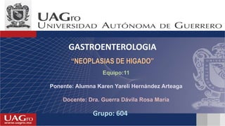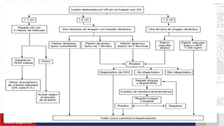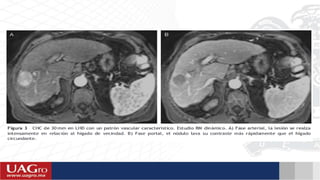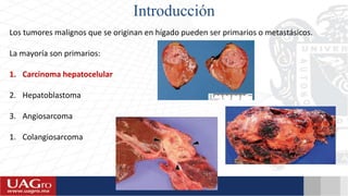 Las neoplasias de hígado incluyen tumores primarios como el carcinoma hepatocelular y metastásicos. Los factores de riesgo incluyen infecciones por VHB y VHC, alcoholismo, obesidad y diabetes. El diagnóstico se realiza mediante ultrasonido, tomografía y resonancia magnética. El tratamiento depende del estadio y puede incluir cirugía, ablación, quimioembolización o sorafenib. El pronóstico depende del número, tamaño y extensión de las lesiones.