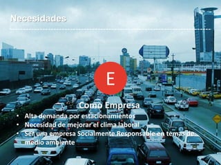 El documento presenta una solución de carpooling mediante una aplicación diseñada para empresas, abordando la alta demanda de estacionamientos y la necesidad de mejorar el clima laboral. La aplicación permite a los empleados compartir rutas, optimizando el uso de plazas en vehículos y reduciendo costos de gasolina y estacionamiento. Se ofrecen análisis de beneficios y programas de incentivos para promover su uso entre los colaboradores.