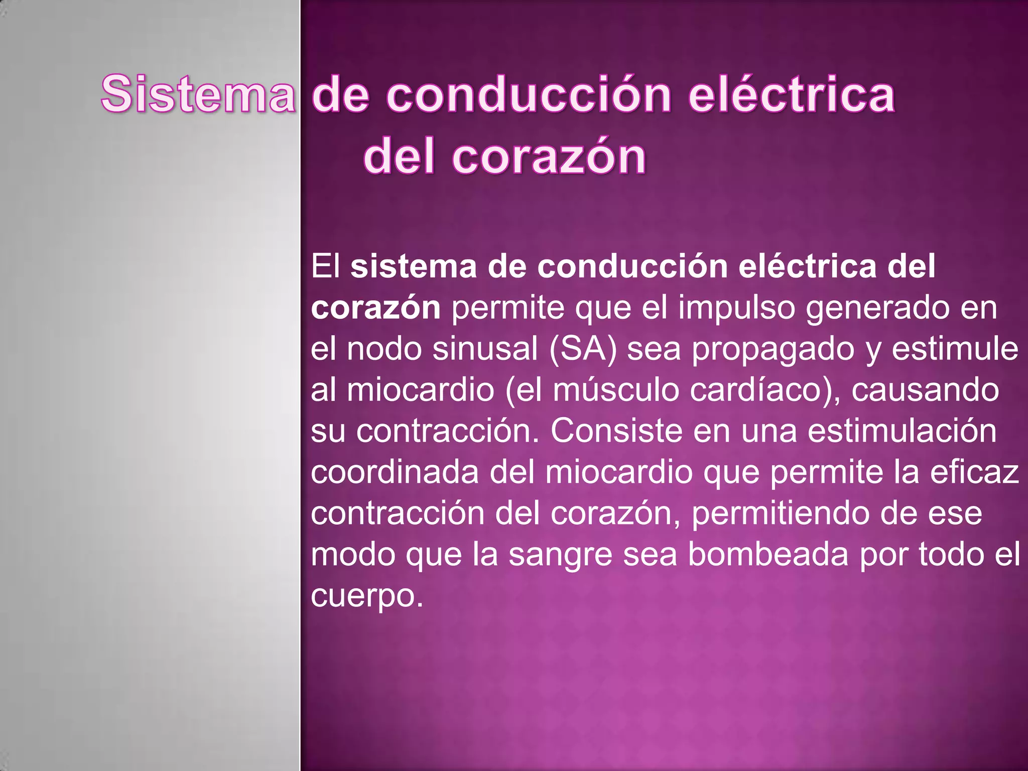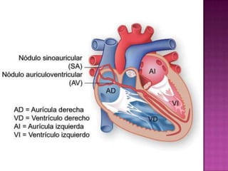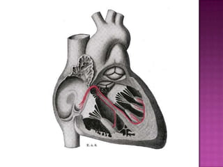 El documento describe el sistema de conducción eléctrica del corazón, que permite la coordinada contracción del músculo cardíaco a través de impulsos eléctricos generados en el nodo sinusal. Estos impulsos estimulan primero la contracción de las aurículas y luego, tras ser retardados brevemente en el nodo auriculoventricular, la contracción de los ventrículos, bombeando la sangre de forma eficiente por el cuerpo.