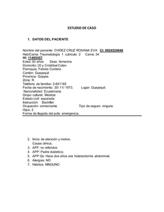 Este documento presenta el caso de una paciente de 50 años con hipertensión arterial de 20 años de evolución que fue ingresada al hospital con disnea, palpitaciones y edema en las piernas. Se realizaron exámenes que mostraron hipertensión arterial mal controlada y retinopatía hipertensiva grado II. El diagnóstico definitivo fue hipertensión arterial. Se prescribieron medidas generales y de enfermería, así como educación al paciente sobre dieta e higiene de vida.