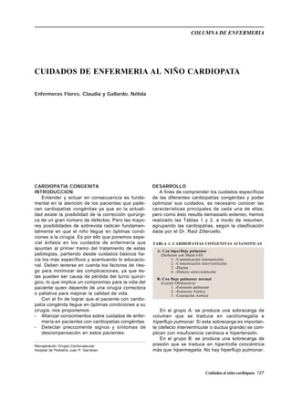 Este documento describe los cuidados de enfermería para niños con cardiopatías congénitas. Explica que es fundamental que el niño llegue en óptimas condiciones a la cirugía correctora. Resume las características de diferentes tipos de cardiopatías congénitas y las complicaciones más comunes como la insuficiencia cardíaca, hipoxemia e hipertensión pulmonar. También describe los signos y síntomas de estas complicaciones y los cuidados de enfermería necesarios para tratarlas y mantener al paciente estable.