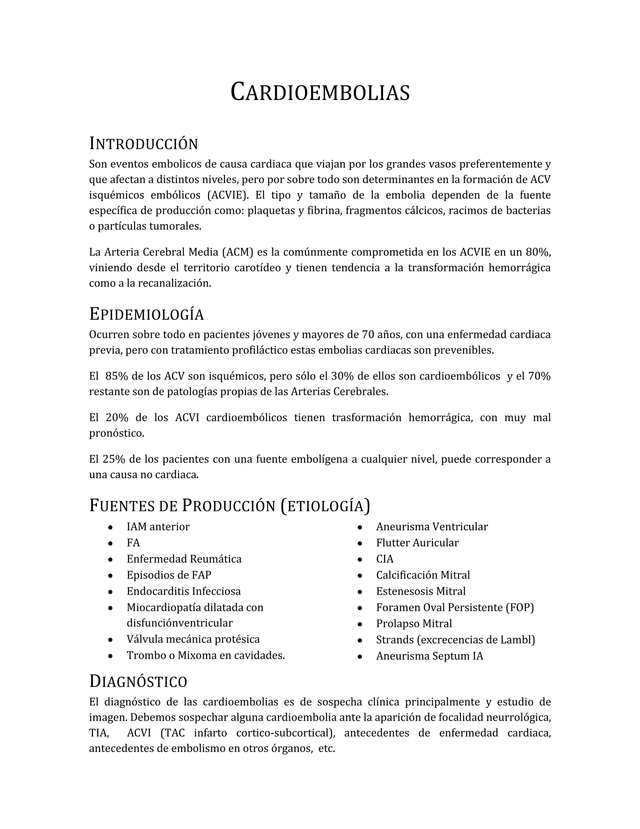Las cardioembolias son eventos embolicos de origen cardiaco que viajan por los vasos sanguíneos y pueden causar accidentes cerebrovasculares isquémicos. La arteria cerebral media es la más comúnmente afectada. Ocurren principalmente en pacientes jóvenes y mayores de 70 años con enfermedades cardiacas previas. El diagnóstico se realiza mediante ecocardiografías y otros estudios de imagen para identificar la fuente cardíaca de la embolia. El tratamiento depende de la causa subyacente y puede incluir antico