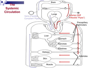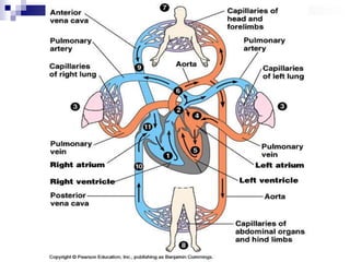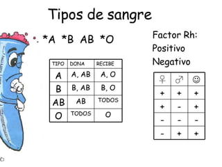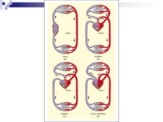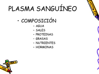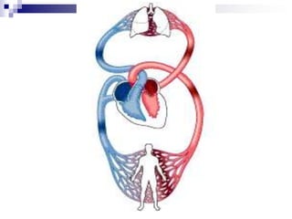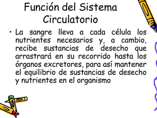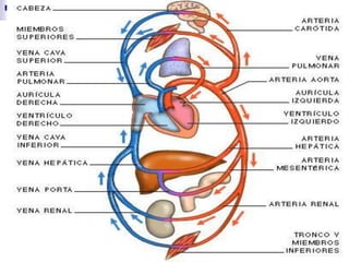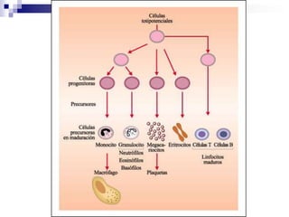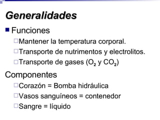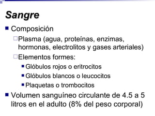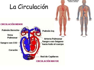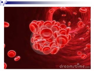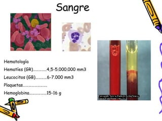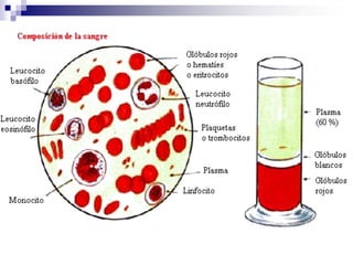 El documento proporciona la fórmula normal del hemograma y describe las funciones y circulación de la sangre. La sangre transporta oxígeno y nutrientes a las células y recoge desechos, los cuales son eliminados por los riñones y pulmones. La sangre circula en dos circuitos: la circulación menor a los pulmones y la circulación mayor al resto del cuerpo.