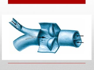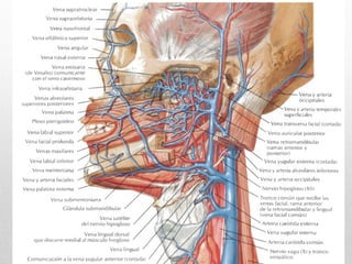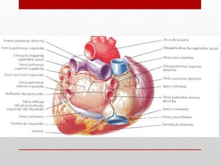 El documento describe el sistema cardiovascular, comenzando con la descripción anatómica del corazón, incluyendo su situación, forma, tamaño y divisiones. Luego describe las características de los ventrículos, atrios, arterias y venas principales como la aorta, tronco pulmonar y yugular interna. Finalmente, detalla las ramas y distribución de las arterias carótidas común interna y externa.