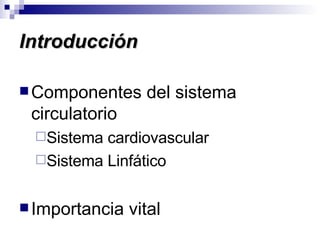 El documento describe el sistema cardiovascular, incluyendo sus componentes principales como el corazón, vasos sanguíneos y sangre. Explica que el corazón bombea la sangre a través de un ciclo cardiaco que incluye la sístole y diástole para transportar nutrientes, oxígeno y desechos a través del cuerpo. También describe la circulación sanguínea a través de los pulmones y el cuerpo, así como la importancia vital del sistema cardiovascular para mantener las funciones del organismo.