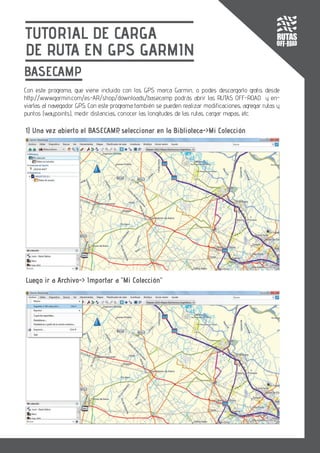 Este documento explica cómo cargar rutas off-road desde el programa Basecamp de Garmin a un GPS Garmin. Primero se abre Basecamp y se importa el archivo KML de la ruta deseada. Luego se selecciona la ruta en Basecamp y se envía al dispositivo GPS. Una vez transferida, la ruta estará disponible en el navegador del GPS para su uso.