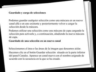 Este documento describe cómo guardar y cargar selecciones en Photoshop utilizando canales alfa. Las selecciones se pueden guardar en un nuevo canal o en uno existente para su uso posterior. Las selecciones guardadas pueden cargarse de nuevo haciendo clic en el canal correspondiente en el panel Canales. Esto permite aislar áreas de una imagen y modificarlas por separado.