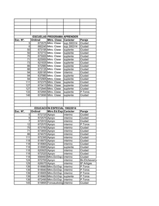 El documento lista los nombres, números de identificación, cargos y ubicaciones de maestros asignados a diferentes escuelas. Los maestros están asignados a escuelas de práctica, educación inicial, escuelas de tiempo completo, el programa Aprender y educación especial en varias localidades incluyendo Ciudad, Achar, Sauce Batovì, Las Toscas y P.Toros.