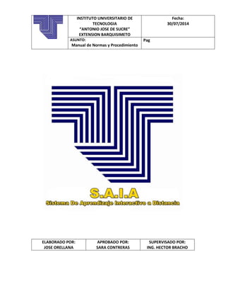 El documento presenta la misión, visión y método del Sistema de Aprendizaje Interactivo a Distancia (SAIA) de la Universidad Antonio José de Sucre. SAIA permite el aprendizaje en línea y semipresencial para facilitar el acceso a la educación desde cualquier lugar. El documento también describe los pasos para desbloquear el acceso a SAIA cuando una cuenta ha sido bloqueada por falta de pago.